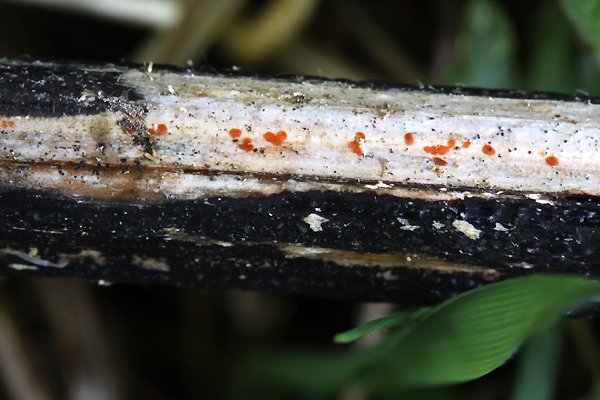 Die Konidien sind in einer Schleimmasse eingebettet und werden orange herausgedrückt, was sehr auffällig ist (siehe in der Mitte des Fotos):