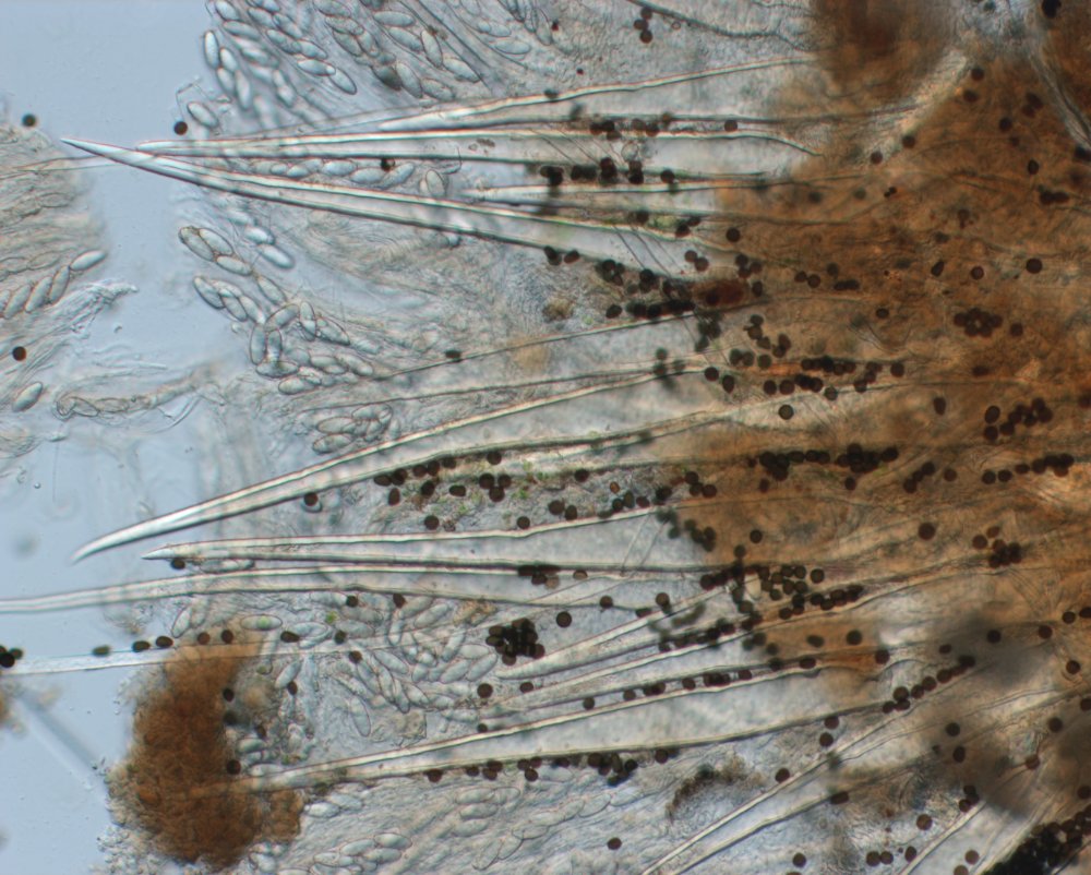 wunderbare Bilder, besonders das Makrofoto, danke fürs Zeigen. Ich glaube aber nicht, dass das L. papillatus ist. Du zeigst leider keine freien Sporen aber man kann schon im Ascus erkennen, das die Sporen auffällig schmal ellipsoid sind und teilweise wohl von einer granulären Schleimhülle bedeckt sind. Diese beiden Merkmale sind typisch für L. macrotrichus. Das Blöde ist, dass in vielen Schlüsseln die Haarlänge als Merkmal verwendet wird, und L. macrotrichus "typischerweise" eben sehr lange Haare hat; dies ist jedoch keineswegs konstant, denn es gibt häufig Kollektionen mit kürzeren Haaren. Ich hänge zum Vergleich noch ein Mikrofoto eines rezenten steirischen Fund von L. papillatus an.