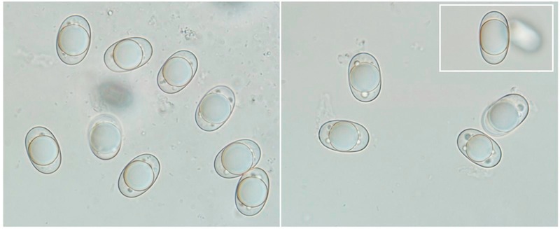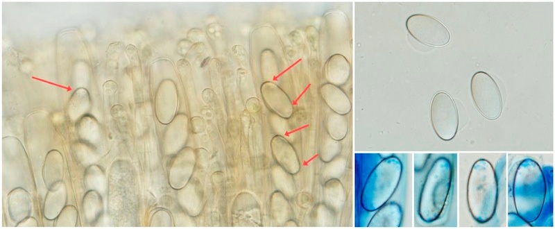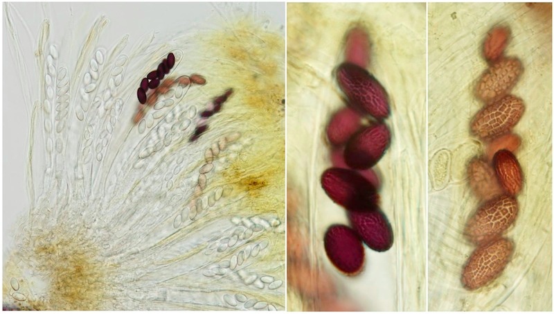 Ein kurzes Stück weiter wurden wir dann von einem zahlreich fruktifizierenden, sepiabräunlichen Becherling überrascht. Erst bei der Beobachtung der Sporen in Baumwollblau wurde das charakteristische cyanophile Sporenornament (oder eher Anlagerungen) an den Polen deutlich. Es handelt sich um: