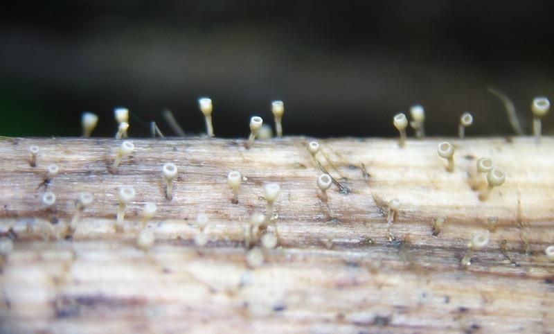 Anna fand dann einen hübschen Becherling auf Stängeln von Ranunculus lanuginosus, den man durch das Substrat und die charakteristische Fruchtkörperform mit dem hochgezogenen Rand eigentlich schon makroskopisch erkennen kann. Auch von dieser Art gibt es noch keine Nachweise in der Ö-Datenbank – es würde sich also lohnen, gezielt an Ranunculus-Stängeln nach ihr zu suchen!