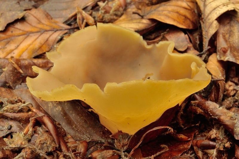 im vergangenen Monat haben wir zu viert den sogenannten Pechelgraben westlich von Rein (Graz-Umgebung) aufgesucht. Gerade an den Forststraßenrändern in Bachnähe erwarteten uns in diesem feuchten Graben zahlreiche spannende Arten (hauptsächlich Ascomyceten), von denen ich nachfolgend ein paar zeige. So mussten wir bereits im Eingangsbereich vor lauter Becherlingen auf die Knie gehen – es gab am Wegrand hunderte (wohl eher tausende) Melastiza-Fruchtkörper, dazwischen aber auch (viel unscheinbarer) diese gelblichen "Teller":