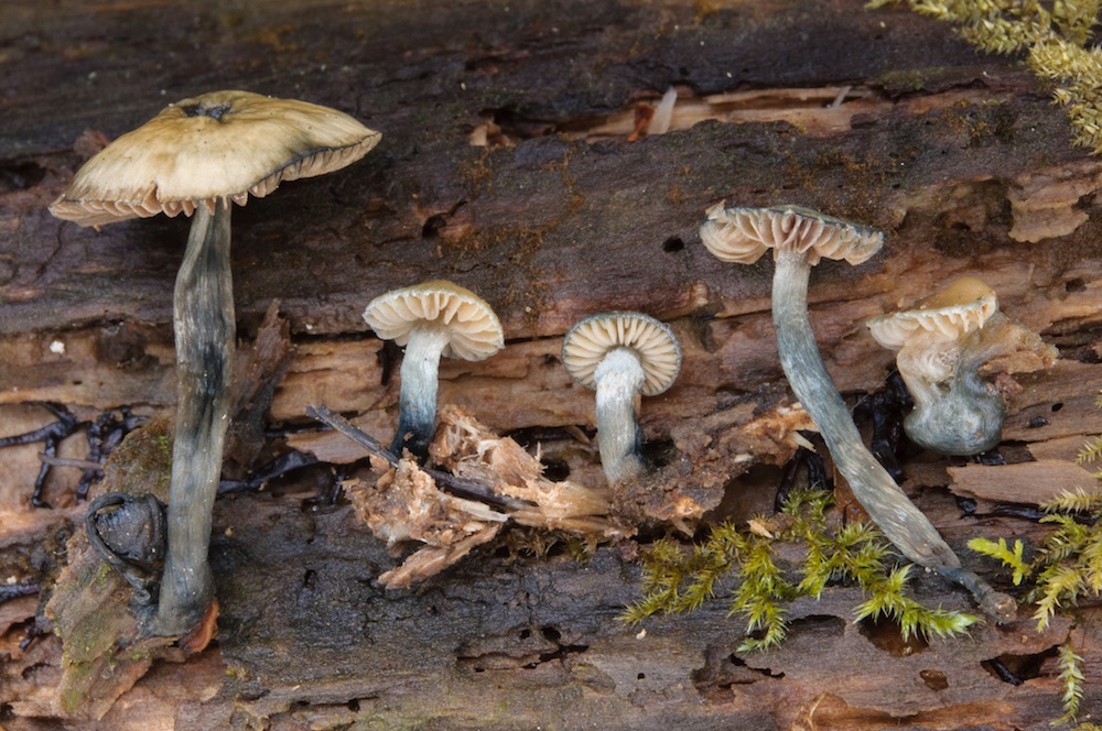 Psilocybe serbica: Über einem Bach liegender, morscher Laubholz-Ast.