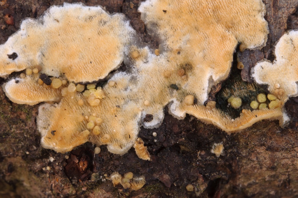 Trichoderma thelephoricola: Liegender Ast von Alnus glutinosa, auf bzw. bei alten Fruchtkörpern von Steccherinum ochraceum.