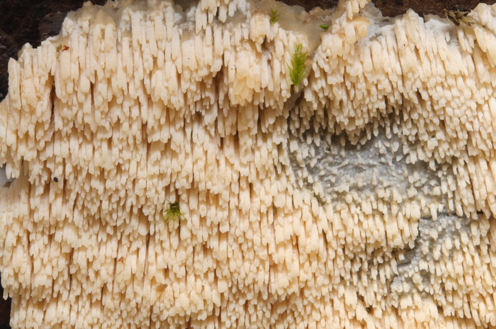 Clavulicium macounii: Stark vermorschter, dicker Nadelholzstrunk, direkt am Bachufer.