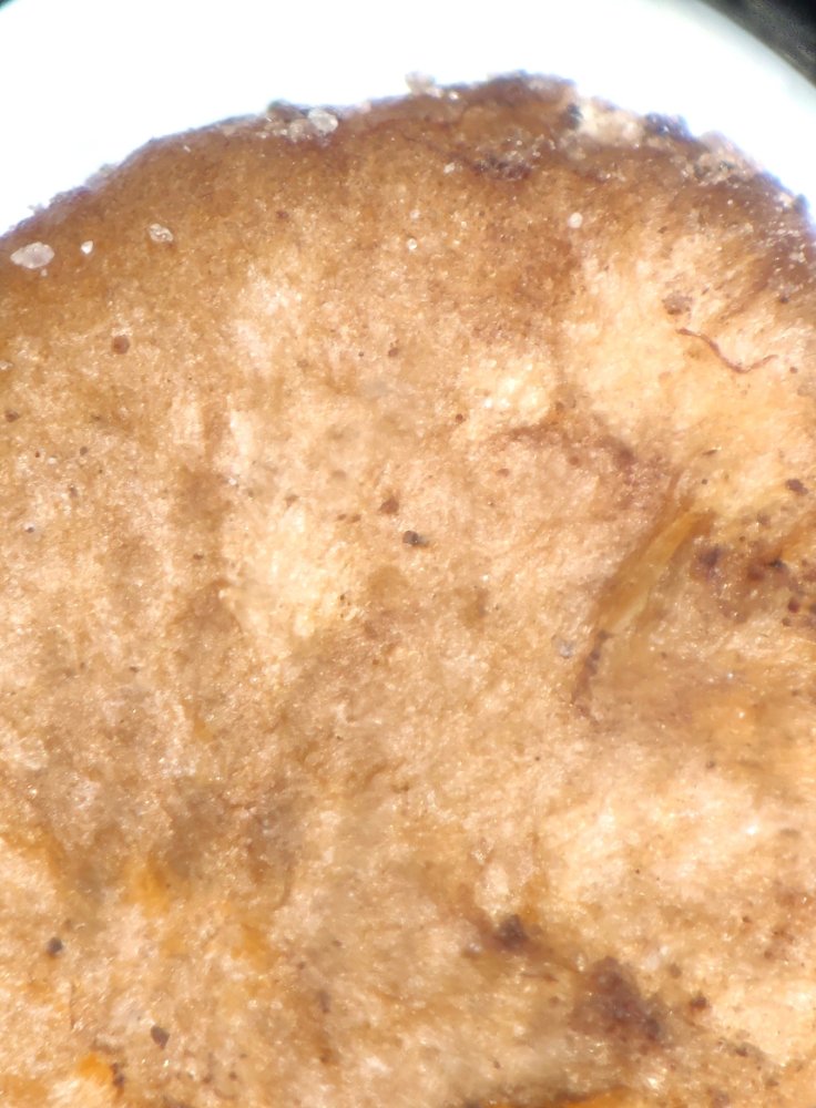 Hier eine gestackte Aufnahme vom Hut. Faserig ja, schuppig sehe ich nicht.