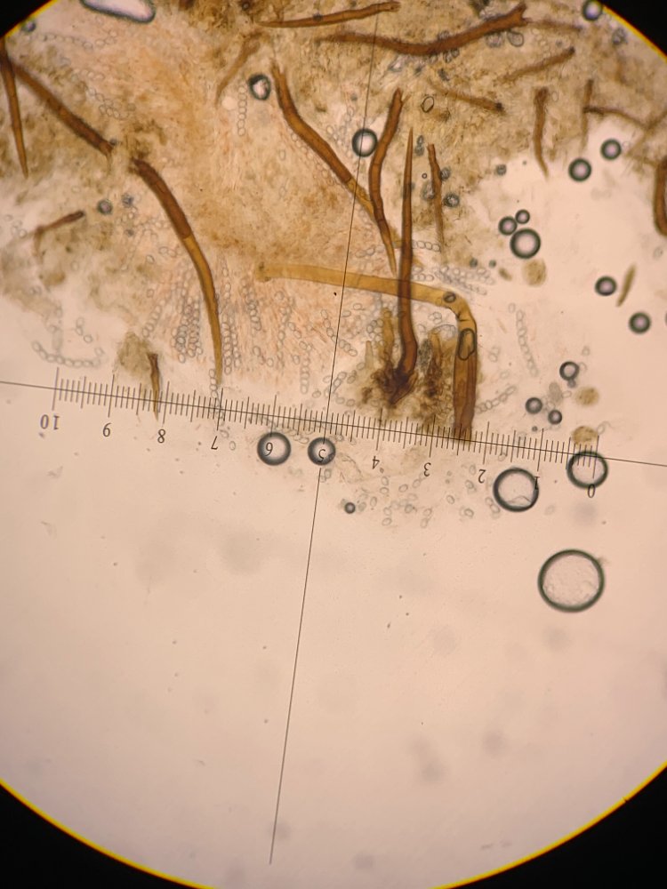 ich würde mal mit S. vitreola vergleichen. Huijser (2020) hat beim Holotypus von S. vitreola Haare von 185-625 x 24-40 µm (im Mittel 402 x 29 µm) gemessen, also auch nicht deutlich über 500 µm. Vereinzelt machen die Haare auf deinen Fotos ja einen längeren Eindruck, aber das kann natürlich täuschen, und du hast sie ja sicher genau vermessen. Jedenfalls scheinen sie multifurkat zu sein, was auch passen würde.
